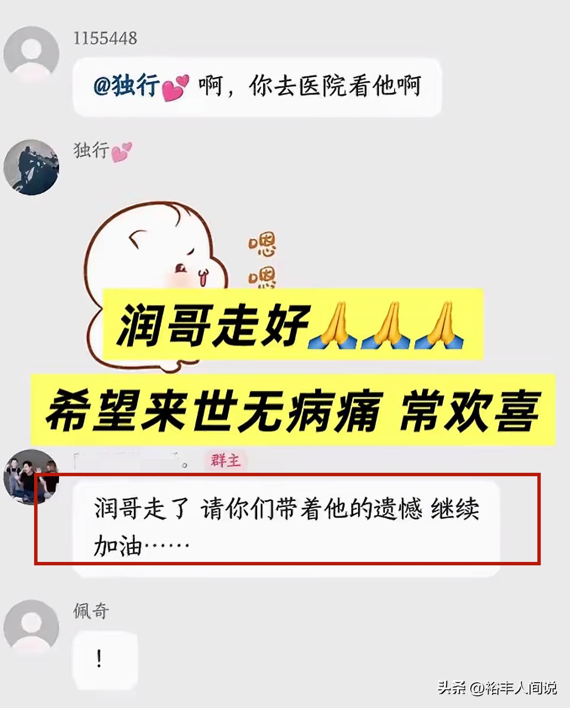 据了解,这一消息并没有在其视频账号上公开,但在群聊中,阿润的妻子已经公开噩耗:润哥走了,请你们带着他的遗憾,继续加油。