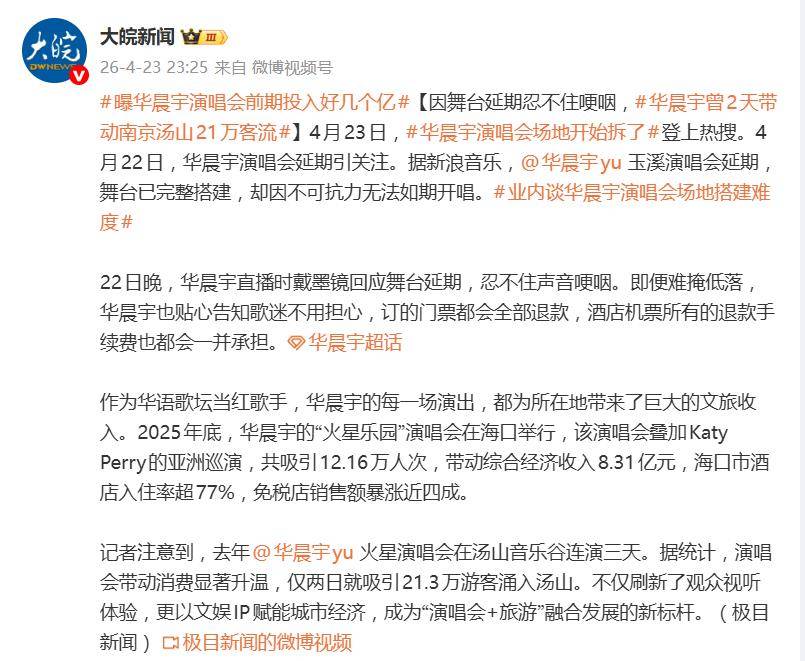 “舞台已经搭好了,却唱不了了。”这句台词,成为了华晨宇和无数“火星人”心中最大的遗憾,关于“华晨宇演唱会场地开始拆了”的消息突然冲上热搜,瞬间让全网疯狂,前一天,华晨宇玉溪演唱会因不可抗力宣布延期,这个消息一出,立刻引发了全网的关注和热议。,据新浪音乐报道,当时的演唱会舞台已经完整搭建,一切准备就绪,却终究没能等来开唱的那一刻,真正让粉丝破防的,是22日晚的那场直播,当晚,华晨宇戴着墨镜现身直播间,试图用轻松的语气回应舞台延期的变故,但即便隔着屏幕,观众也能清晰感受到他声音里的哽咽,面对这突如其来的打击,他没有抱怨,反而第一时间贴心安抚歌迷:不用担心,所有已订的门票都会全额退款,连带着酒店、机票的退改签手续费,也全部由他承担。,一句“我来扛”,让不少网友直呼“太心疼了”,作为华语乐坛的顶流歌手,华晨宇的演唱会向来不只是演出,更是一场拉动地方经济的“文旅盛宴”,2025年底,他的“火星乐园”演唱会在海口举办,正好撞上Katy Perry的亚洲巡演,两场活动叠加,共吸引12.16万人次到场,带动综合经济收入高达8.31亿元,那段时间,海口市酒店入住率直接飙升至77%以上,免税店销售额更是暴涨近四成,堪称“一场演唱会带火一座城”的教科书级案例。,再往前看,去年华晨宇的火星演唱会在汤山音乐谷连演三天,仅两日就吸引了21.3万游客涌入汤山,消费热度肉眼可见地飙升,媒体评价称,这不仅刷新了观众的视听体验,更以文娱IP赋能城市经济,成了“演唱会+旅游”融合发展的新标杆,而这次玉溪演唱会的延期,牵动的远不止歌迷的心。,据网传消息,这场演唱会前期投入高达好几个亿,筹备了数年之久,甚至连场地都买了下来,华晨宇原本打算将其打造成一个集舞台、游乐园、住宿、咖啡厅、餐饮于一体的“火星乐园”——一个真正属于歌迷的沉浸式音乐王国,如今演出延期,舞台开拆,这笔损失可想而知。,在直播中,华晨宇虽难掩低落,却始终没有过多抱怨,他只是轻声告诉歌迷:“别担心,都会处理好的。”在这个舞台上,他或许暂时无法开口唱歌,但那份对歌迷的承诺,已经掷地有声。