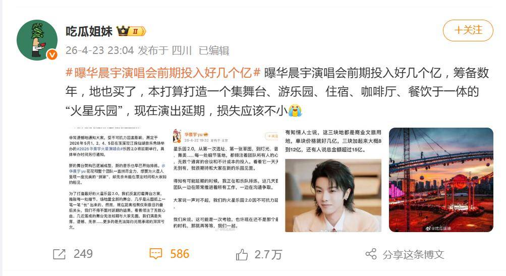 据网传消息,这场演唱会前期投入高达好几个亿,筹备了数年之久,甚至连场地都买了下来。华晨宇原本打算将其打造成一个集舞台、游乐园、住宿、咖啡厅、餐饮于一体的“火星乐园”——一个真正属于歌迷的沉浸式音乐王国。如今演出延期,舞台开拆,这笔损失可想而知。