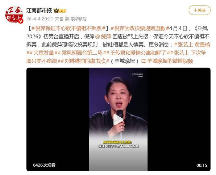 倪萍在《乘风2026》的初舞台直播中,由于人情味过于浓烈、屡次干预赛制,引发了广泛争议。次日一开场,她便以一场道歉三连和当众宣读保证书的举动,迅速成为4月4日舆论的焦点人物。