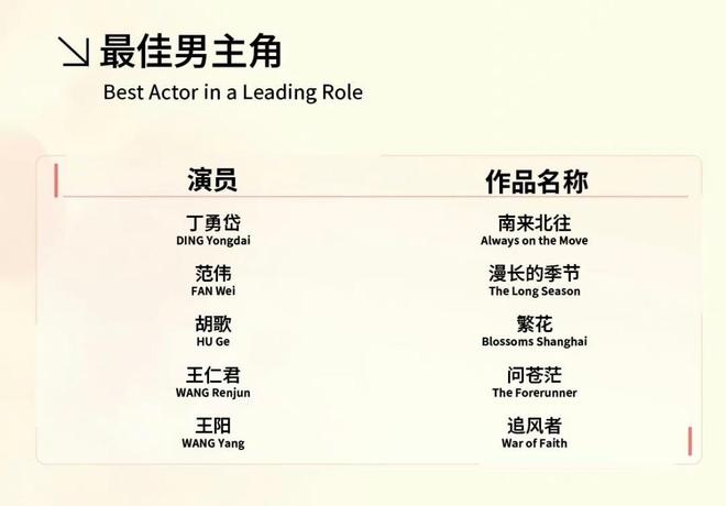 除了胡歌《繁花》外,本届提名的还有:丁勇岱《南来北往》、范伟《漫长的季节》、王仁君国度《问苍茫》、王阳《追风者》,你期待谁夺视帝?