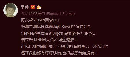 2022年5月19日上午十点,歌手吴尊在网上发文称为女儿NeiNei圆梦,带她看了Jojo Siwa 的演唱会,还晒出一组九宫格照片。吴尊在文中写到"再次帮NeiNei圆梦,陪她看她优质偶像Jojo Siwa 的演唱会,NeiNei还写信告诉Jojo她是她的头号粉丝,结束后,NeiNei太舍不得还流泪...让我也想到那时很舍不得飞轮海的最后一场演出,还好我们都有好好珍惜,也很感恩曾经拥有,Dream Huge...The world is your stage"