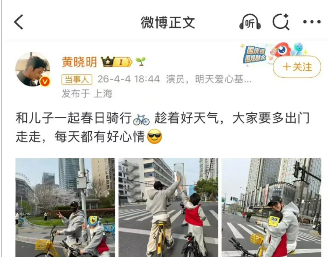 4月4日,黄晓明在微博晒出与9岁儿子的户外骑行照。照片里,他骑着共享单车,儿子骑着儿童自行车,两人在人行道前击掌合影,画面温馨自然。