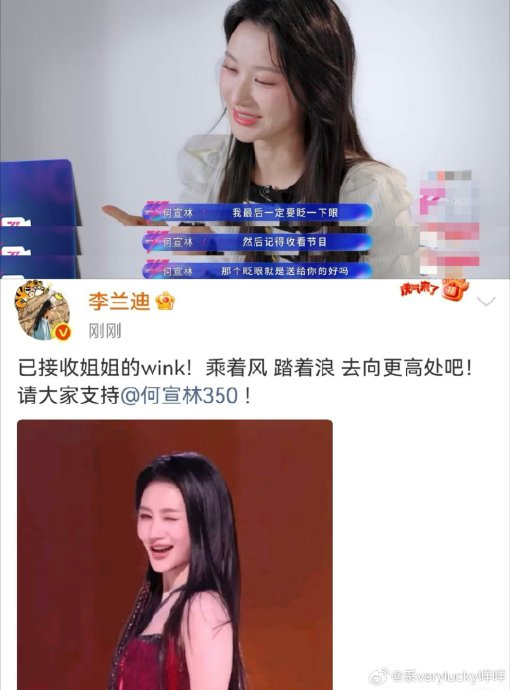 两人因2023年仙侠剧《星落凝成糖》结缘,剧中饰演生死相依的姐妹青葵与夜昙,戏外则延续了亲密无间的关系。三年间,她们互送手工礼物(如何宣林为李兰迪织水杯套背包)、日常连麦打气、探班互动,被粉丝称为“离光姐妹售后”。赛前何宣林因紧张失眠,李兰迪的一句“你本就是会发光发热的小太阳”成为她的定心丸。这种经年累月的真诚互动,让观众相信wink背后是无需表演的信任。