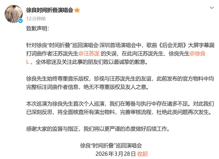 【#徐良方回应漏打汪苏泷名字#】#徐良方发声明致歉# 3月27日,徐良“时间折叠”巡回演唱会·深圳首场演唱会中,歌曲《后会无期》大屏字幕漏打词曲作者汪苏泷,引发关注。28日,@徐良时间折叠演唱会 发布致歉声明,并表示将全面核查所有演出物料,完善审核流程,杜绝此类问题再次发生。