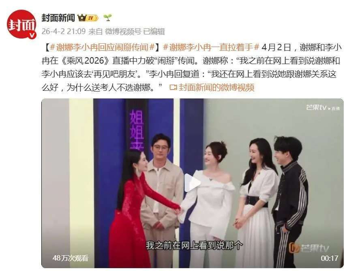 据4月2日晚间的报道,《乘风2026》初舞台的一场直播,意外地变成了两位明星闺蜜谢娜与李小冉的谣言粉碎现场。两人全程紧握双手,互相嬉笑打趣,将此前网络上流传的闹掰传闻当作直播素材,亲自出面用幽默的方式一一解答。谢娜的开场,直接抓住了网友热议的话题,她一开场便主动挑起话题:我之前在网上看到,说谢娜和李小冉应该去‘再见吧朋友’。这一话题引发了现场观众的关注,紧接着,李小冉也毫不客气地接住了话头,补充道另一条罪状:我还看到有人问,说你和谢娜关系这么好,为什么送考人没有选她。两人一边调侃,一边把网络上的争议全盘摆在镜头前讨论,反而没有丝毫的尴尬,反而笑容满面,彼此之间的默契令人感到温暖。