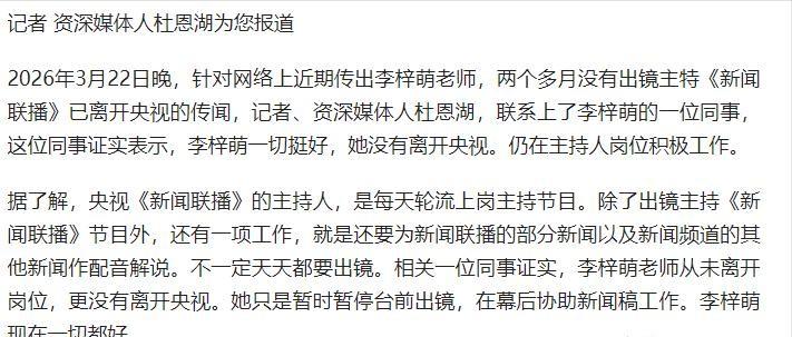 新闻联播主播李梓萌突然“消失”,离职传闻闹得沸沸扬扬,如今同事出面发声,真相终于水落石出。