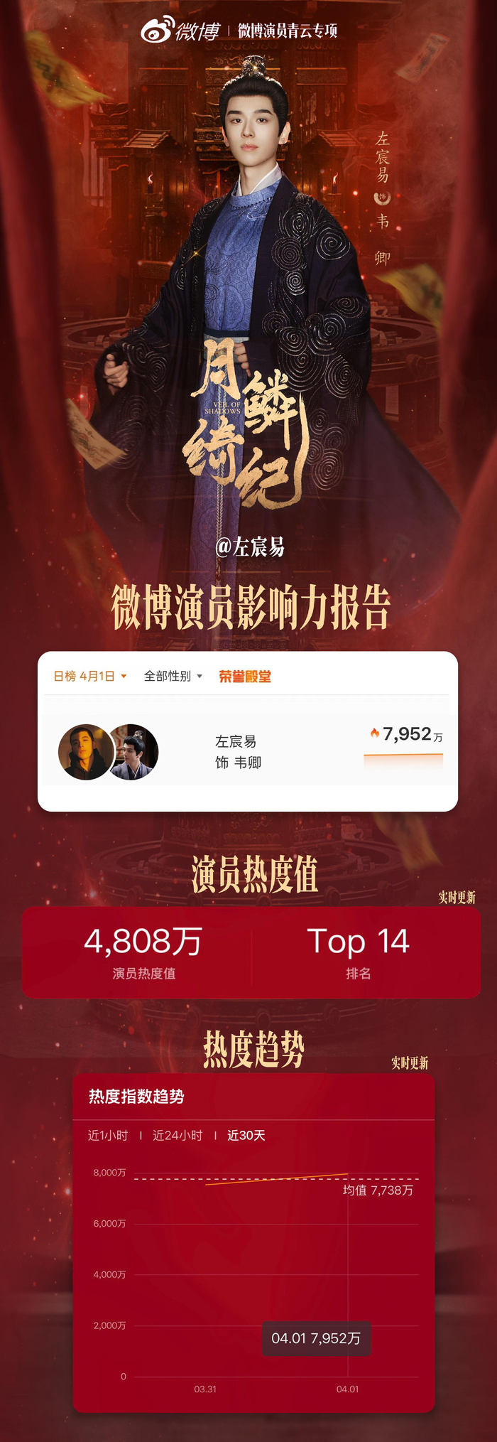 #微博青云演员专项# 恭喜@左宸易 !《月鳞绮纪》上线首日,微博演员影响力指数破7000万~速速追剧!见证韦卿精彩表现#上新了内娱#