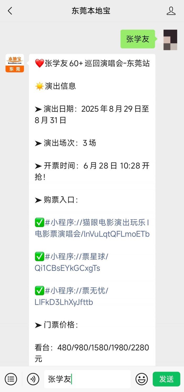温馨提示:微信搜索并关注【东莞本地宝】公众号,在对话框回复【张学友】即可获取2025东莞张学友演唱会最新消息(购票入口、门票价格、开票时间、座位图、演出时间、地点交通等)!