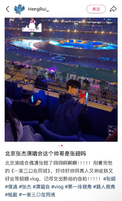 3月27日晚,张杰“未·LIVE—曜·北斗”巡回演唱会北京站在鸟巢举行。多名现场观众发布图文及视频,确认张翅现身观众席。粉丝镜头捕捉到他与蔡国庆同框,身穿休闲装束、神情专注投入演出。相关话题#张翅看张杰演唱会#随即登上热搜,粉丝纷纷表示“直播说的音乐活动破案了”“原来翅翅是隐藏的‘杰迷’”。此外,有观众提到他坐在前排区域,全程跟随合唱,展现出对音乐现场的真挚热爱。
