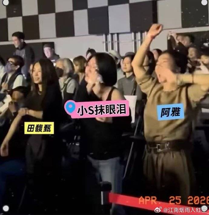 小S、阿雅、田馥甄等圈内好友纷纷现身支持。小S穿着黑色露肩T恤搭配牛仔裤,戴着眼镜,手里拿着一只杯子,全程情绪波动明显。当范晓萱唱到代表作《管他什么音乐》时,小S和阿雅更是直接登台,即兴伴舞,仿佛又回到了当年四人一起疯一起闹的时光。