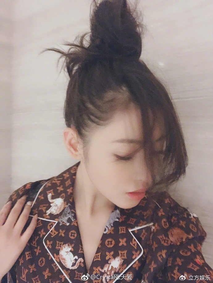 张天爱绑着丸子头,长长的刘海随意散落却依然无法抵挡住美貌,十分妩媚吸睛。