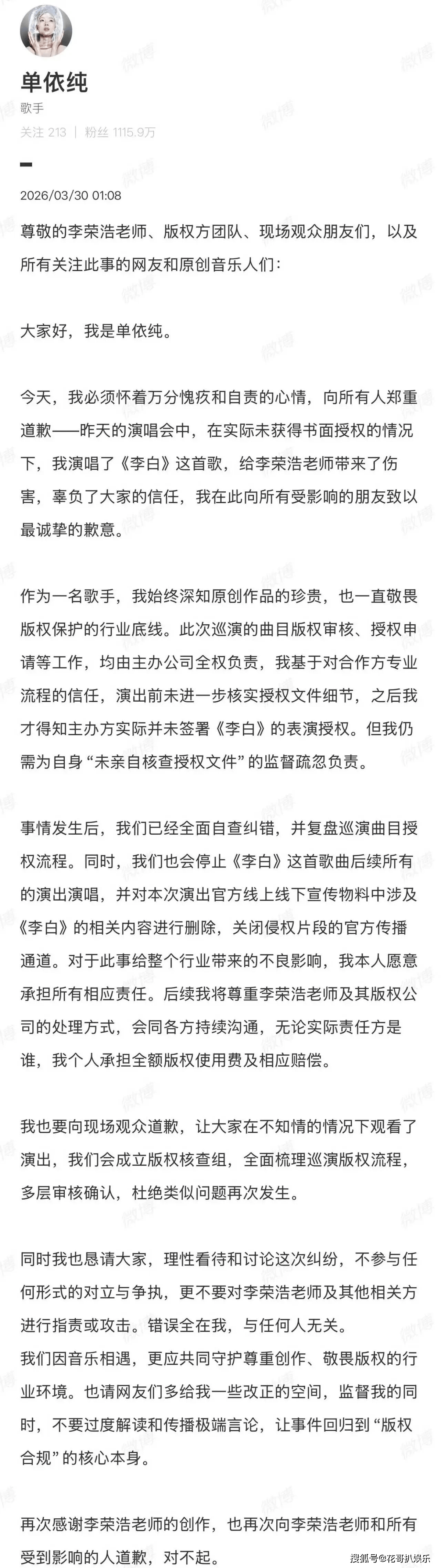 李荣浩手撕单依纯这事,估计很难简简单单解决了。一开始单依纯发了个声明道歉,还装作没事人一样继续演出,结果没想到事情发展不可控,只好深夜再发长文道歉。按照她的说法,她这次的演唱会所有事宜都是由主办公司负责的,关于演唱曲目授权问题她并不清楚,所以不知道《李白》这首歌的授权主办公司没有谈妥。