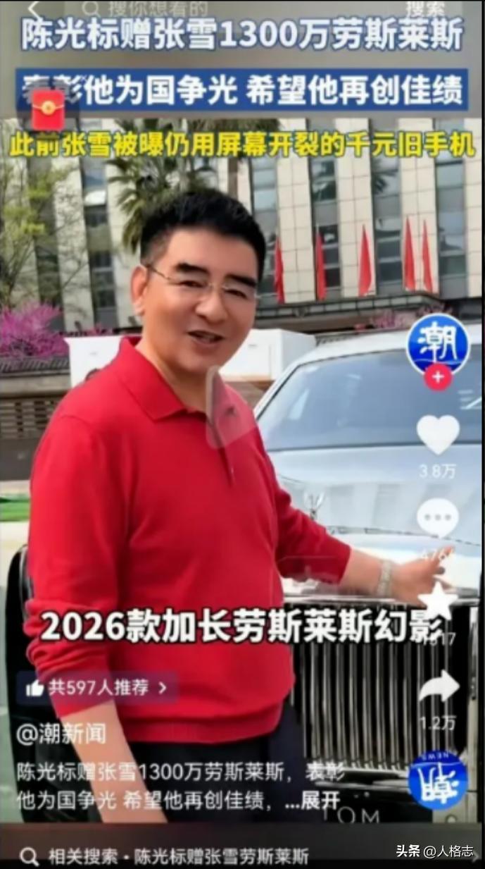 陈光标尿性不改,果然又对张雪扑将过来了。他高调宣称要“赠送张雪一台价值1300万的2026款加长劳斯莱斯幻影”。