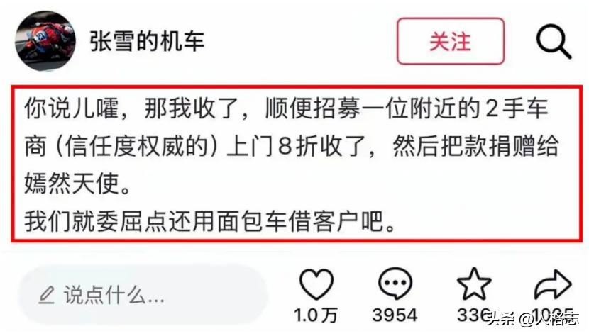他直接喊话——“收了,卖了,捐了”。请注意,张雪最牛逼的是,权威二手车商去上门收,然后,把钱赠给嫣然天使基金。