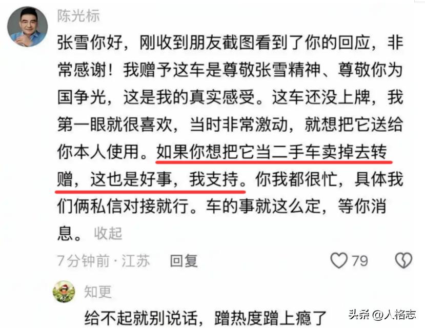陈光标先是紧急澄清——我这车是奖励爱国精神,是只供张雪个人使用的,是不能转售转赠的,你张雪那么做就是“误会了初心”……