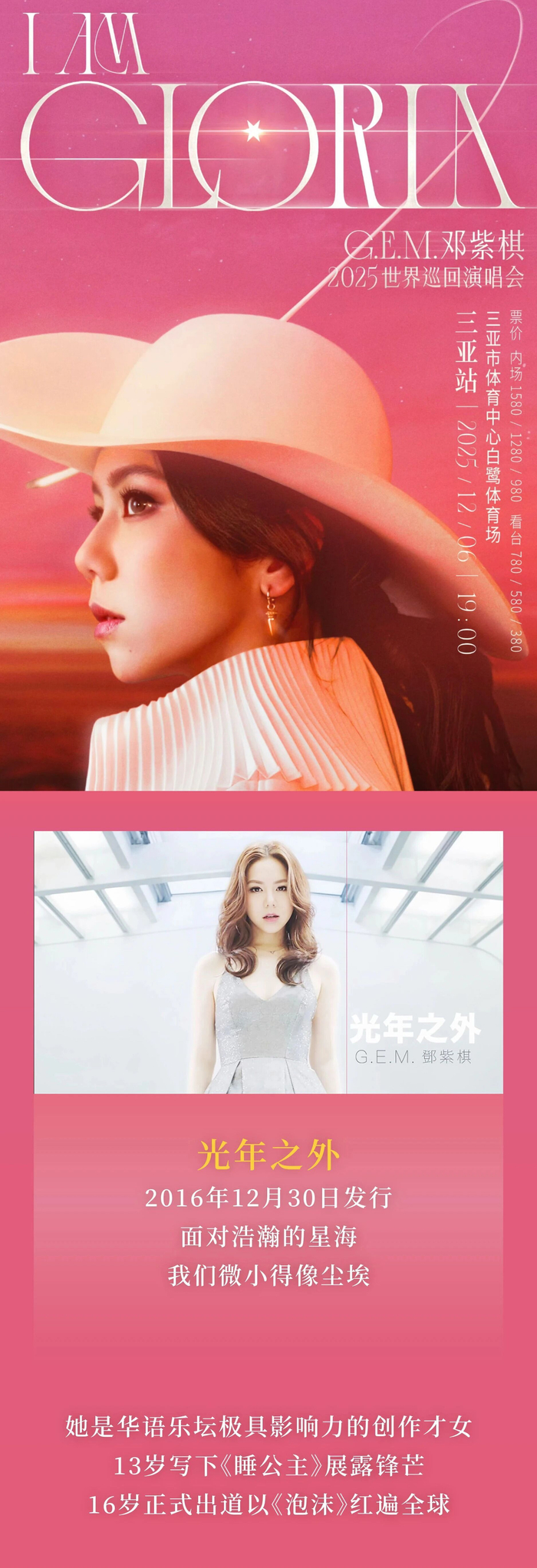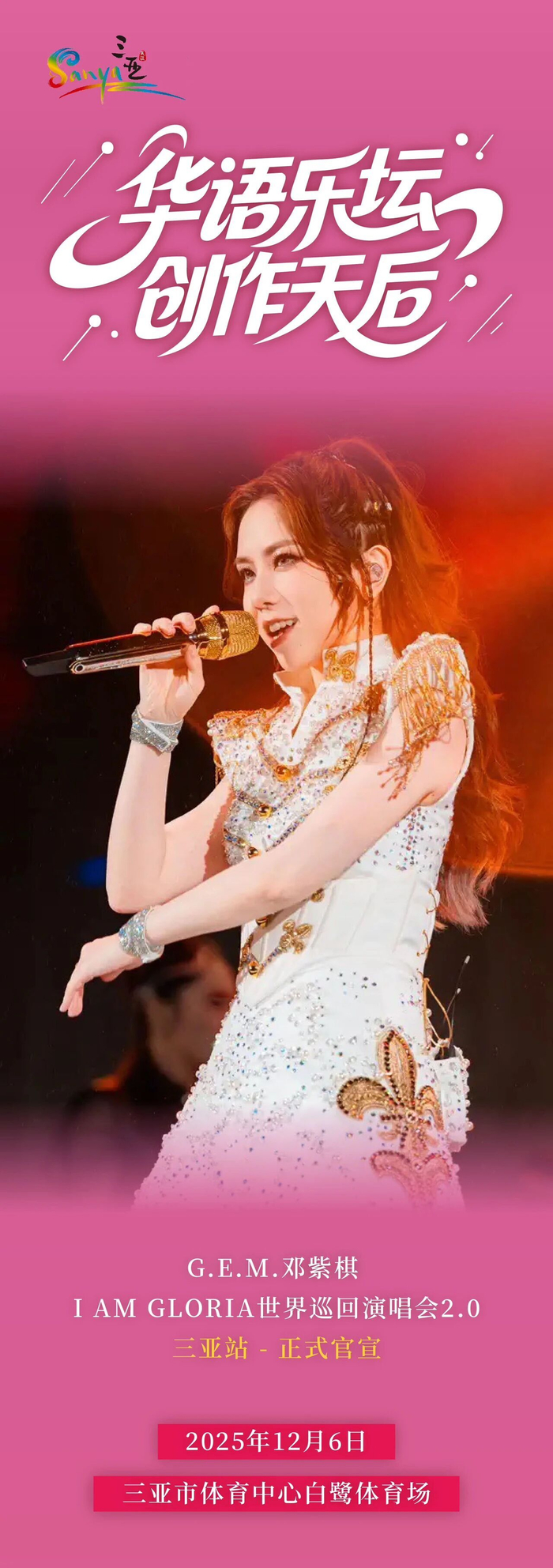 ## 邓紫棋三亚演唱会:一场“紫色狂欢”的完美呈现, , 在2025年的12月6日,三亚市体育中心的白鹭体育场上,一场别具一格的音乐盛宴正式拉开帷幕,邓紫棋的"I AM GLORIA"世界巡回演唱会在中国三亚站正式官宣开幕,这场演唱会不仅是一场音乐的盛宴,更是一场“紫色狂欢”的完美呈现。, , 演唱会当天,三亚的天气温暖宜人,白鹭体育场内人头攒动,来自四面八方的粉丝们早早就到场,他们穿着各色版式的“I AM GLORIA”粉丝服,手握着手机,全神贯注地等待邓紫棋的到来,当邓紫棋的巡回团体化身为一道光的瞬间,全场沸腾了。, , 邓紫棋的舞台表现毫无疑问是这场演唱会的最大亮点,她身穿一袭酷炫的银色舞衣,舞台设计充满未来感的科技感与艺术感,宛如一只璀璨的“白鹭”展翅高飞,她的舞台表现力惊人,歌声清澈动人,舞姿灵动夺目,完全征服了全场观众。, , 在这场演唱会中,我们看到了邓紫棋作为一名“全球女王”的多重面貌,她带来了一些经典曲目,如《我不是黄蓉》《月牙湾》《致青春》等,演唱时她时而大声澎湃,时而细腻动人,展现了她在不同风格音乐中都能精准把握的表演功底,而在一些舞蹈型的曲目中,她的舞台表现更是惊艳,仿佛将整个白鹭体育场都收入了她的舞台之中。, , 热情的粉丝们也是这场演唱会的一部分,他们用热烈的掌声、欢呼声、哨声,为邓紫棋加油助威,特别是在邓紫棋提到三亚这个城市时,全场响起了热烈的掌声,邓紫棋感动地回应了粉丝们的热情,拉近了与粉丝之间的距离。, , 这场演唱会的加点演出更是让人印象深刻,邓紫棋带来了一些未出镜面的新曲,还特别邀请了当地的当地乐队进行合作,展现了她对中国文化的理解与热爱,特别是邓紫棋与当地乐队的《中国风》合唱,既展现了她对中国文化的尊重,也让现场气氛更加热烈。, , 这场演唱会是一场完美的音乐盛宴,邓紫棋用她的音乐和舞台表现力,带来了无数观众的感动与快乐,她的音乐风格多样,舞台表现力强劲,加上她对粉丝的真诚态度,让这场演唱会成为了三亚市体育中心白鹭体育场历史上最具观赏性和影响力的音乐活动之一。