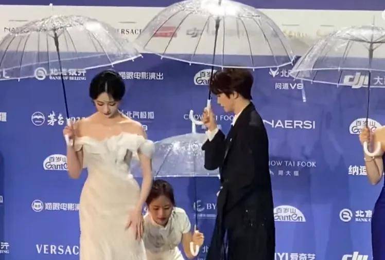 电影《偷偷藏不住》剧组出场的时候,雨已经下得很大了,女主朱珞宁的裙摆在湿地上一直拖到背景板前,还得麻烦礼仪帮忙整理。