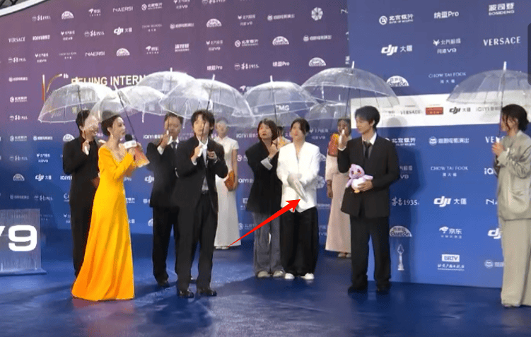 马思纯不知道是不是怕伞把挡住镜头,拍大合照的时候频繁转伞,伞上的雨水似乎都甩到了旁边人的身上,搞得旁边的人频频看向马思纯。不过马思纯似乎没有注意到这个细节,还笑呵呵的,有点儿粗心哦!