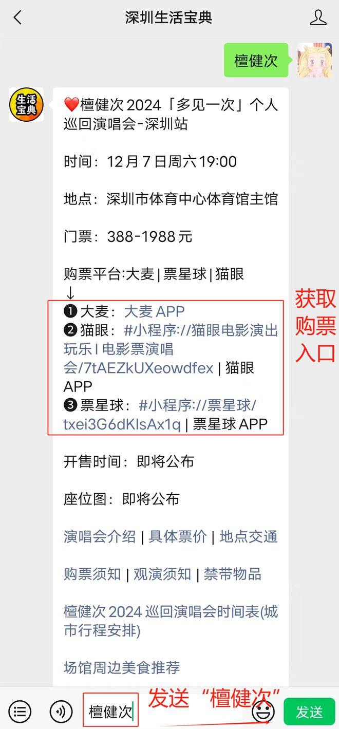 大麦/票星球、猫眼,,扫描或长按识别下面二维码,关注【深圳生活宝典】公众号,在对话框发送【檀健次】即可获取檀健次深圳演唱会购票入口、查看演出具体时间、地址、具体票价、座位图、购票及退票须知、演出场馆附近的酒店、吃喝玩乐推荐、公交地铁停车场指南等