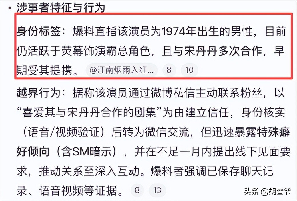 据悉,一位1974年出生、常年演霸道总裁还和宋丹丹多次合作的男演员,被指主动私联粉丝。