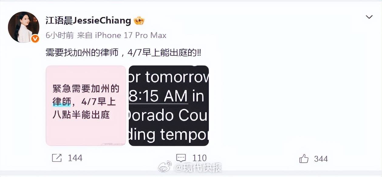 4月7日凌晨,一则紧急求助在社交平台炸开了锅。曾因出演周杰伦《最长的电影》MV女主而为人熟知的艺人江语晨,突然发文求助:“紧急需要加州的律师,4月7日早上八点半能出庭。”消息一出,瞬间引发网友围观和猜测。