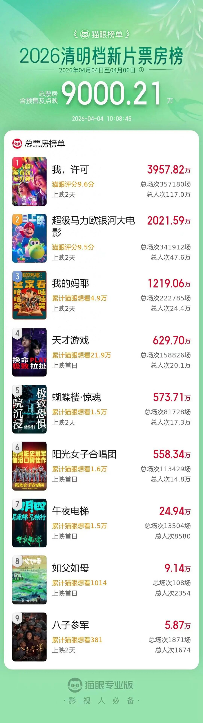 据猫眼专业版数据,截至4月4日10时08分,2026年清明档新片总票房破9000万,《我,许可》《超级马力欧银河大电影》《我的妈耶》暂列清明档新片票房榜前三位。