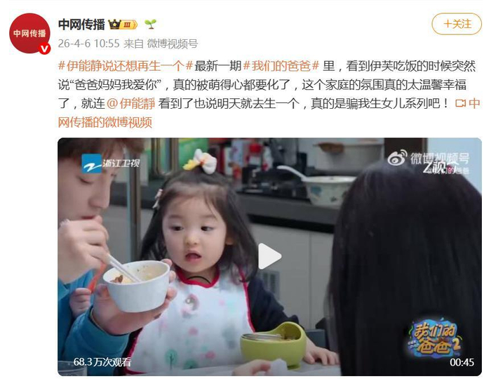 据4月6日报道,最新一期《我们的爸爸》里,萌娃叶泽伊芙吃饭时突然一句“爸爸妈妈我爱你”,瞬间暖化了屏幕内外。这猝不及防的甜蜜“暴击”,不仅让观众直呼“骗我生女儿”,更让观察室里的伊能静当场破防,忍不住感慨:“明天就去生一个!”