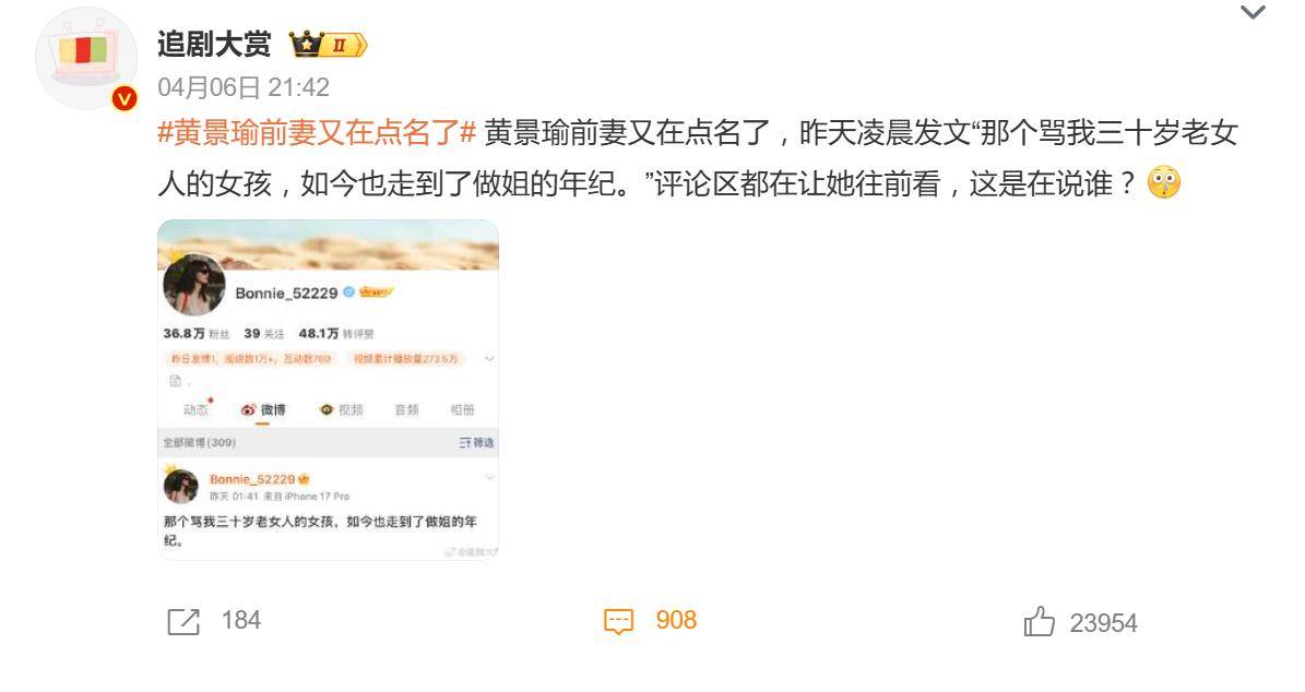 据网友4月6日晚间爆料,4月5日凌晨,黄景瑜前妻王雨馨在社交媒体上的一句“那个骂我三十岁老女人的女孩,如今也走到了做姐的年纪”,瞬间点燃了吃瓜网友们的好奇心。这没头没尾的一句话,评论区劝她“往前看”都压不住网友的好奇心:这到底是在点名谁?