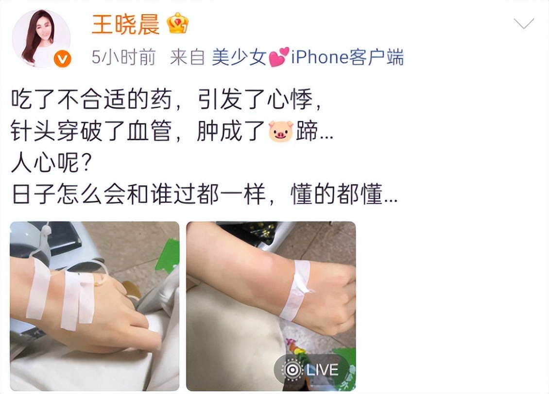 她发文说自己误食不合适的药物,突发心悸,还吐槽输液时被护士扎破血管,手臂肿得厉害。