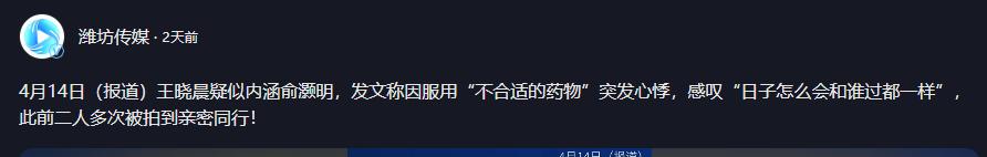 【1】2026年4月14日发布 潍坊传媒《4月14日(报道)王晓晨疑似内涵俞灏明,发文称因服用“不合适的药物”突发心悸,感叹“日子怎么会和谁过都一样”,此前二人多次被拍到亲密同行!”》