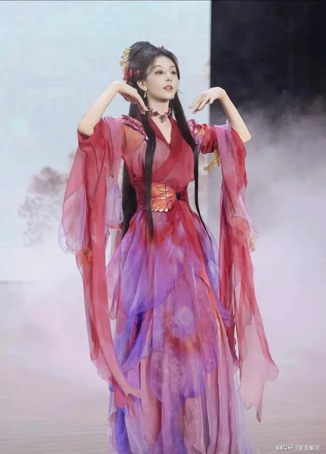 方媛一身红紫轻纱裙,这是她的第一次古风装扮吧。发髻高挽,身段柔软,一张古典美人脸,仙气十足。