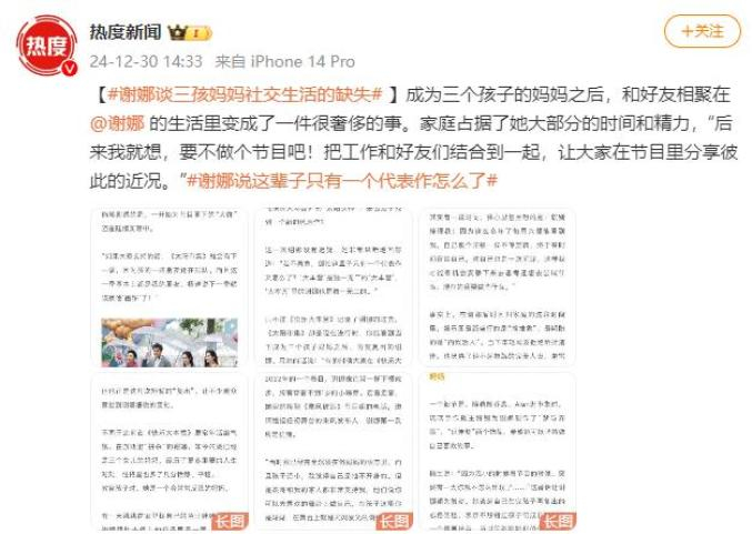 12月30日,据江西广播电视台《热度新闻》栏目报道,近日,谢娜接受了媒体记者采访,在采访中,她谈及了成为三孩妈妈后复出重新工作的心路历程;也谈及了离开《快乐大本营》后面临的争议。
