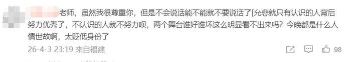 然而,体谅归体谅,有一个核心问题确实不能混淆,《乘风2026》是一档竞技类节目,而非温情脉脉的合家欢综艺。观众选择观看这类节目,核心期待是看到姐姐们突破自我、用硬实力公平比拼,见证"乘风破浪"的励志与热血。竞技的本质就是有输赢、有淘汰、有残酷的规则,它需要的是铁面无私的专业评判,而非和稀泥式的"端水"。