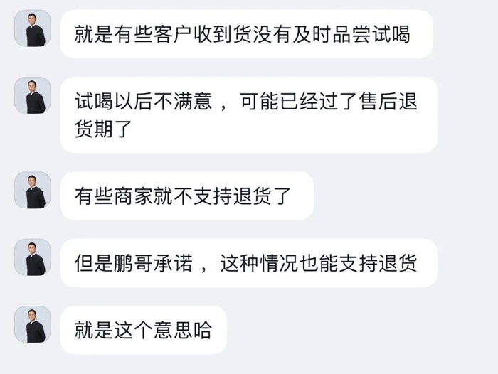在当晚的直播中,李亚鹏承诺,消费者在其直播间内购买茶叶超过7天也能进行售后处理:“任何时候,虽然过了那个保障期,你觉得不好了,你就都跟我们直播间抖音小助理联系。我鹏哥今天在这承诺一下,但是有可能违规,我就不说那么透,我一定会给大家一个一个的认真去解决这些事情。”
