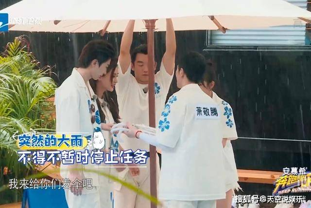 雨越下越大节目组只好暂停任务,虽然下雨和萧敬腾没什么关系,但大家都在说“雨神”的梗,萧敬腾也感觉不好意思,然后给大家发伞。