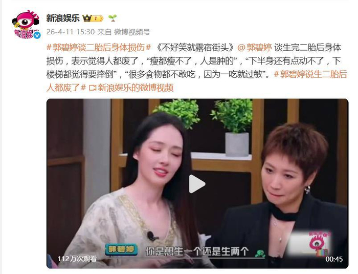 据4月11日报道,郭碧婷在综艺《不好笑就露宿街头》中的一番坦诚分享,直接戳中了许多妈妈的痛点。与脱口秀演员小鹿聊起二胎话题时,这位一向以温婉形象示人的女星,毫不掩饰地吐露了生育带来的身体困境,一句“感觉整个人有点‘废’”,瞬间引发了广泛共鸣。