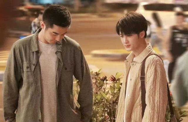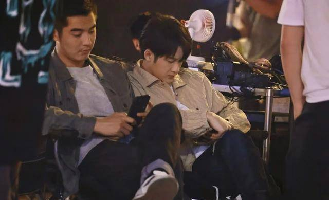 在没有戏的时候,两人蹲在墙壁的一角玩手机。檀健次的身旁还放着一把雨伞,看上去像是两个结伴出游的少年。