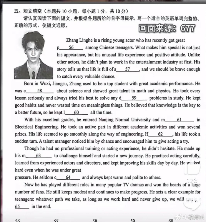 我跟你们说,最近这事儿可太逗了,一个明星,居然跑到我闺女英语卷子上去了! 就那个演《逐玉》的张凌赫,我闺女拿回来的新概念英语试题,里面一大段阅读理解,讲的居然是他从学霸跨界当演员的故事。 我一看就乐了,这出题老师挺潮啊,紧跟热点。 结果上网一搜,好家伙,这事儿前几天还上了热搜,但人家张凌赫自己呢,压根没出来回应,该拍戏拍戏,该干嘛干嘛,这心态可以。
