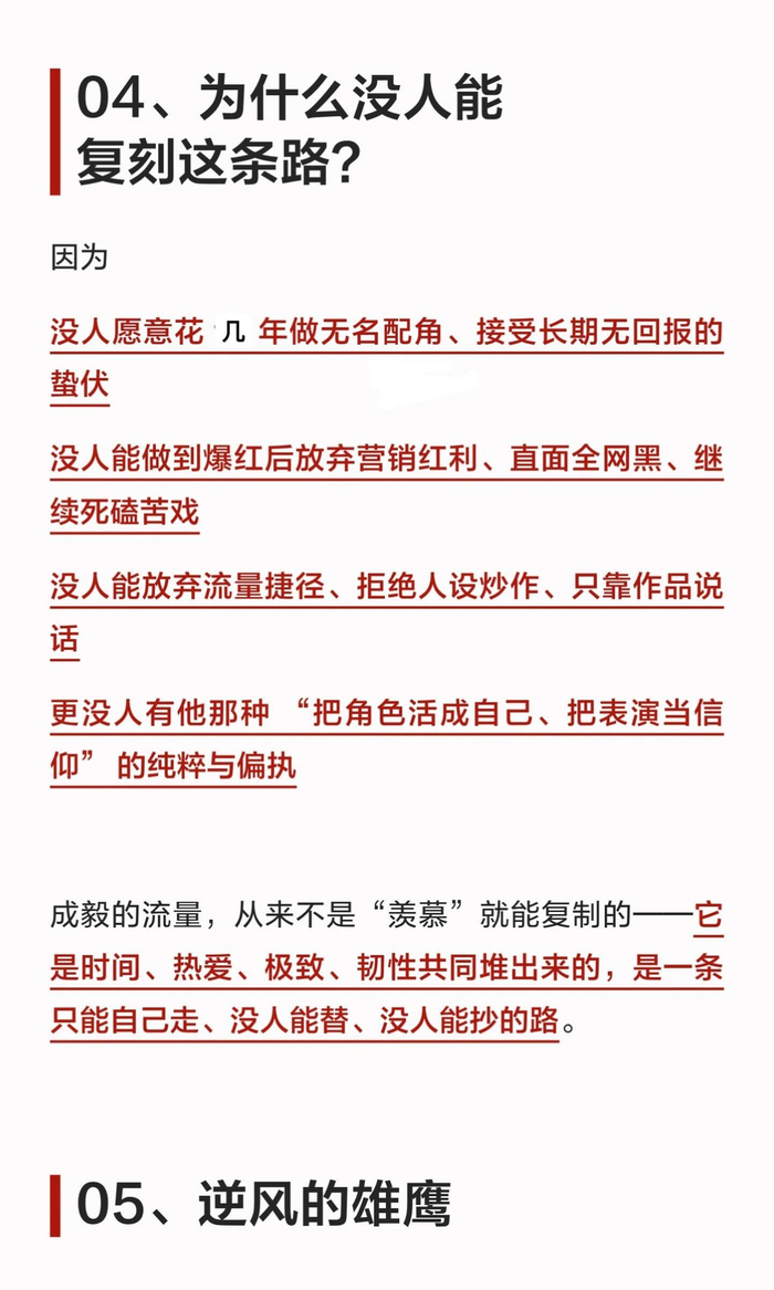 成毅15年蛰伏,极致自律,全网黑淬炼,用100%投入和敬业打破流量逻辑,凭借角色质感和作品口碑成为顶流,证明真正的流量是演员与角色的双向奔赴,绝非捷径可复刻。