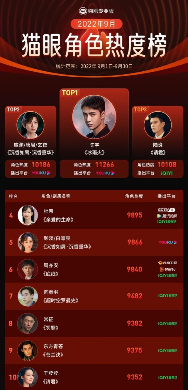 从猫眼数据上看,九月份角色热度前十名的有王一博饰演的陈宇、任嘉伦饰演的陆炎、成毅饰演的应渊、王鹤棣饰演的东方青苍等。