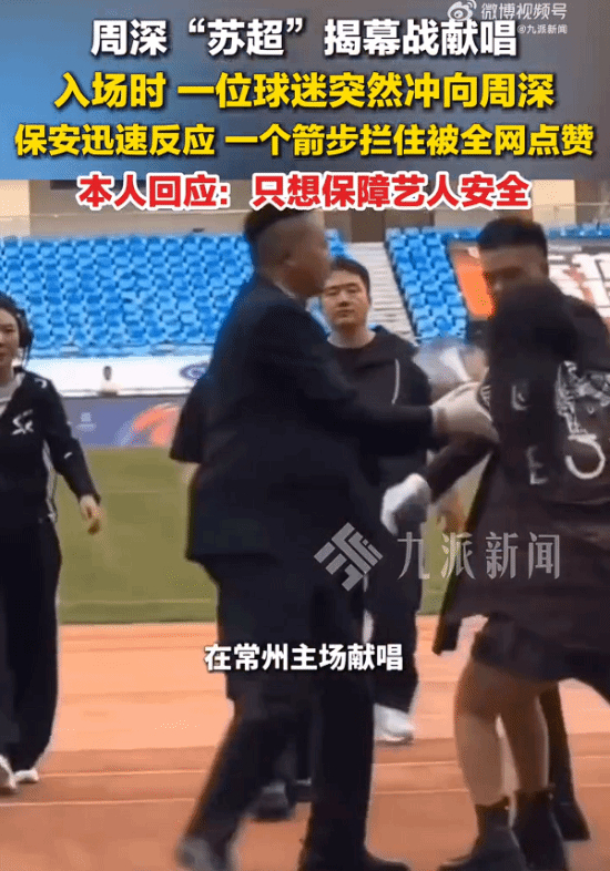 4月11日,周深现身苏超揭幕战,在常州主场献唱。入场时,他热情地与球迷打招呼。突然,一位球迷冲上前,保安迅速反应,一个箭步就护住了周深。此举引发网友点赞,认为以后的安保工作都应以此为标准。
