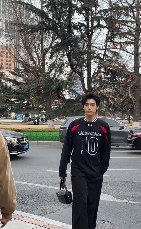 那会儿,他穿着一件深色的球衣,下面搭了条宽松的运动裤,肩背个偏商务的黑色双肩包,反差挺明显的。头发没怎么整理,刘海垂到眉毛,鬓角还有点翘起来,整体看着挺随意的。