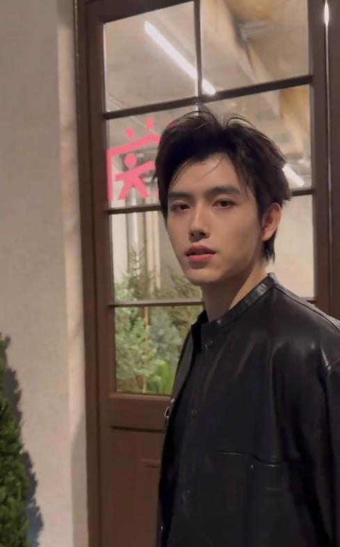 他穿了一件黑色粒面皮衣,亮面皮料在灯光下散发出高级光泽,高领带拉链的设计既干练又增添了气势。
