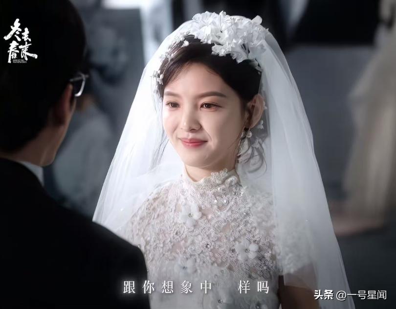 是章若楠穿了一身雪白的婚纱,从窗帘后面走出来,头上白色的花瓣,搭配婚纱上亮晶晶的钻石。