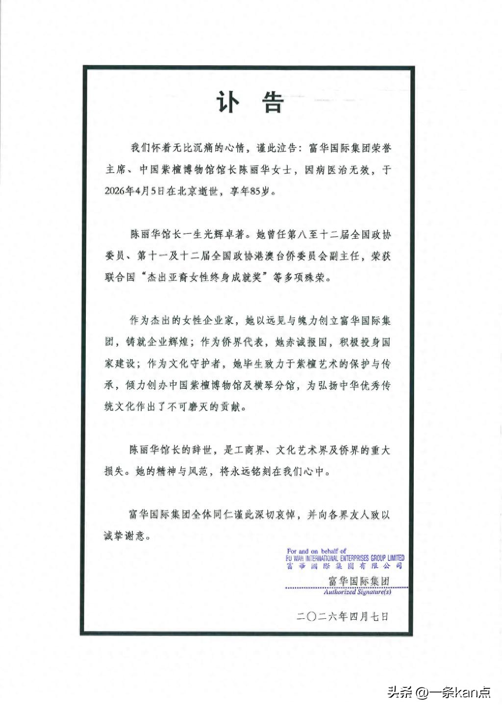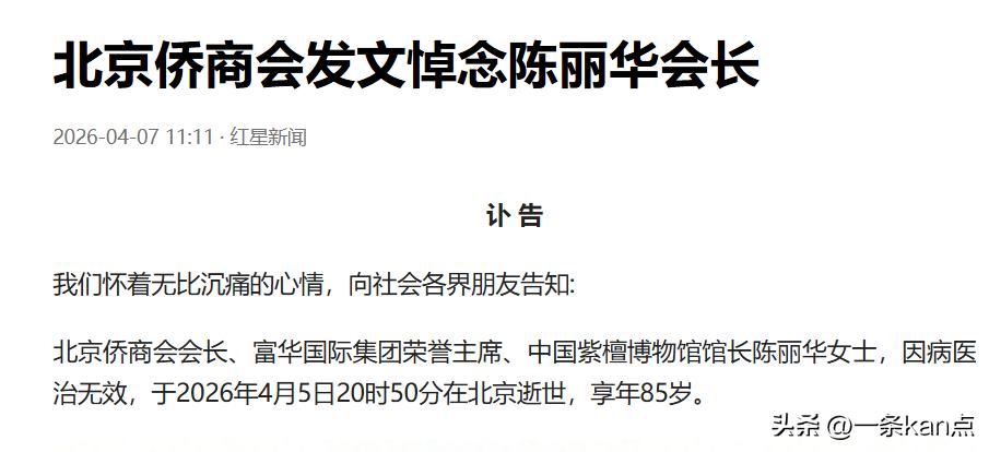 2026年4月5日,北京的春风还没有吹散清晨薄雾的时候,在各大平台上就有一条消息传开了——富华国际集团荣誉主席、中国紫檀博物馆创始人陈丽华走完了自己85年的传奇人生。