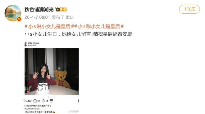 4月6日,小S(徐熙娣)在社交平台为小女儿许曦恩(Alice)庆祝14岁生日的方式,再次让网友直呼“太有梗了”。她发布搞怪祝福,直接称女儿为“皇后”,并留言:“恭祝皇后~福泰安康~”,瞬间引发热议。