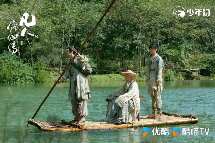 虽是修仙题材,《凡人修仙传》在制作上却打破了绿幕拍摄等惯性,大胆采用多地实景拍摄。主创团队历时158天辗转浙江、贵州、新疆五地取景,并使用大量航拍镜头,用独属于中国壮美山河的自然风光让修仙世界的想象落地化,同时融入传统文化元素。其中,黄枫谷、掩月宗仙人所乘坐的飞行物,灵感采风源于中国古代画卷里的“槎”, 用树根或者是树的截面去制作,在天空中遨游可饮茶饮酒吟诗作画,故称为“仙人乘槎”;另外剧中的法术特效、生物角色设计、包括雷电光火,也结合了自然景象的呈现。