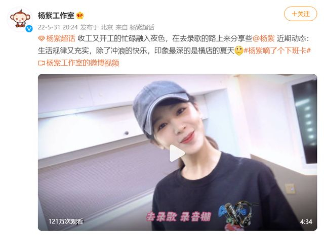5月31日,杨紫工作室就晒出了杨紫收工的视频,并配文称:收工又开工的忙碌融入夜色,在去录歌的路上来分享些杨紫近期动态:生活规律又充实,除了冲浪的快乐,印象最深的是横店的夏天。