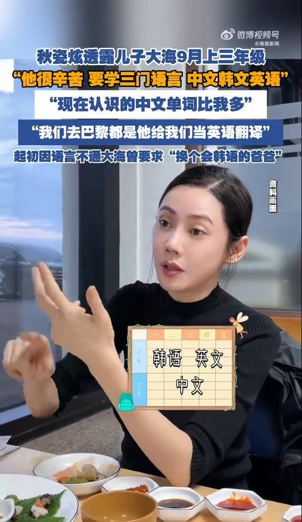 最近秋瓷炫在视频里聊起儿子大海,把网友们都逗乐了。这个9月就要上三年级的7岁小朋友,正同时学着中文、韩文和英文三门语言,压力不小但成果惊人——连妈妈都承认“他认识的中文单词比我还多”。最绝的是全家去巴黎旅行时,大海直接变身“首席翻译官”,用英语帮爸妈沟通,流利程度让网友直呼“这语言天赋是开了挂吧”。